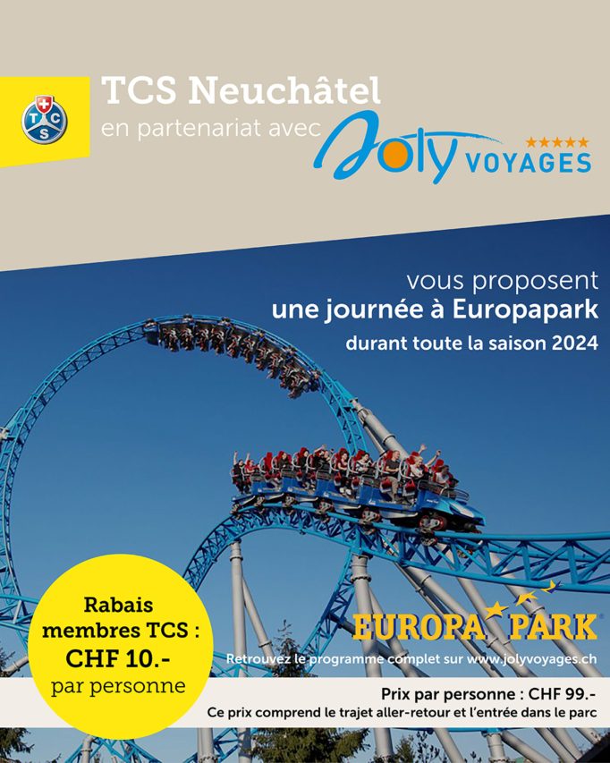 Le TCS Neuchâtel et Joly Voyages vous emmène passer une journée de détente au parc d’attraction Europa-Park à Rust. Choisissez parmi nos nombreuses dates et profitez d’une journée de 9h sur place dans le parc.